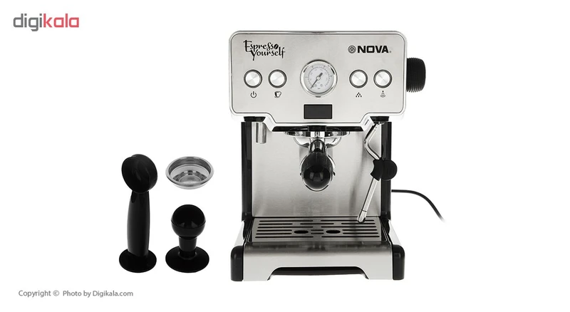 اسپرسوساز 1.7 لیتری نوا، مدل NOVA NCM-128EXPS، مناسب تهیه اسپرسو، کافه لاته، موکا، کاپوچینو، ماکیاتو، امکان تنظیم فاصله لیوان و نازل، دارای سیستم گرم‌کن فنجان، دارای یک عدد نازل قهوه، سیستم شست‌وشوی خودکار