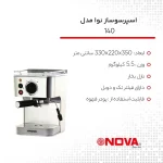 اسپرسوساز 1.2 لیتری نوا، مدل 140، مناسب تهیه اسپرسو، کافه لاته، کاپوچینو، امکان استفاده از پودر قهوه، قابلیت تنظیم میزان بخار به صورت دستی، دارای یک نازل