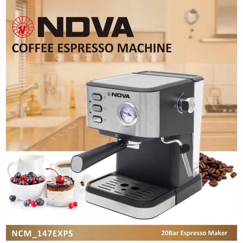 اسپرسوساز 1.6 لیتری نوا، مدل NCM-147، مناسب تهیه اسپرسو، کافه لاته، کاپوچینو، امکان استفاده از پودر قهوه، قابلیت تنظیم میزان بخار به صورت دستی، دارای یک عدد نازل قهوه