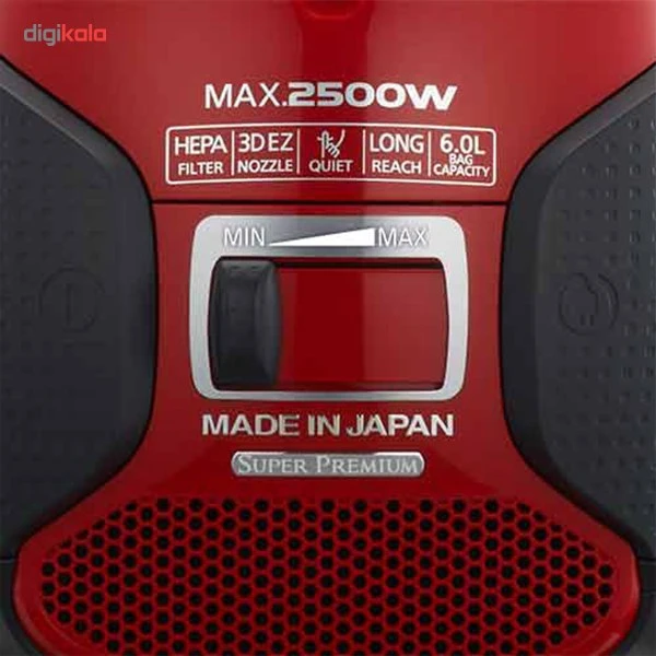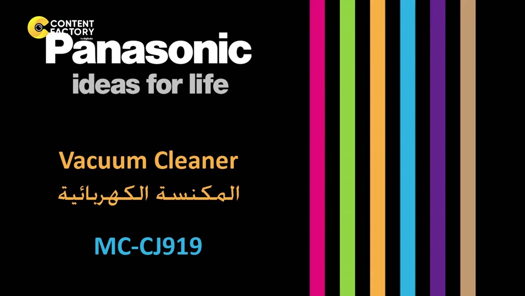 جاروبرقی کیسه‌‎دار پاناسونیک مدل MC-CJ919، با فیلتر HEPA، وزن 10 کیلوگرم، دارای سه عدد سری مجزا، موتور با قدرت 2500 وات، میزان صدا 60 دسی‌بل، طول کابل برق 7 متر، گنجایش مخزن 6 لیتر، دارای کیسه پارچه ای، دارای غلتک و ضربه گیر نرم